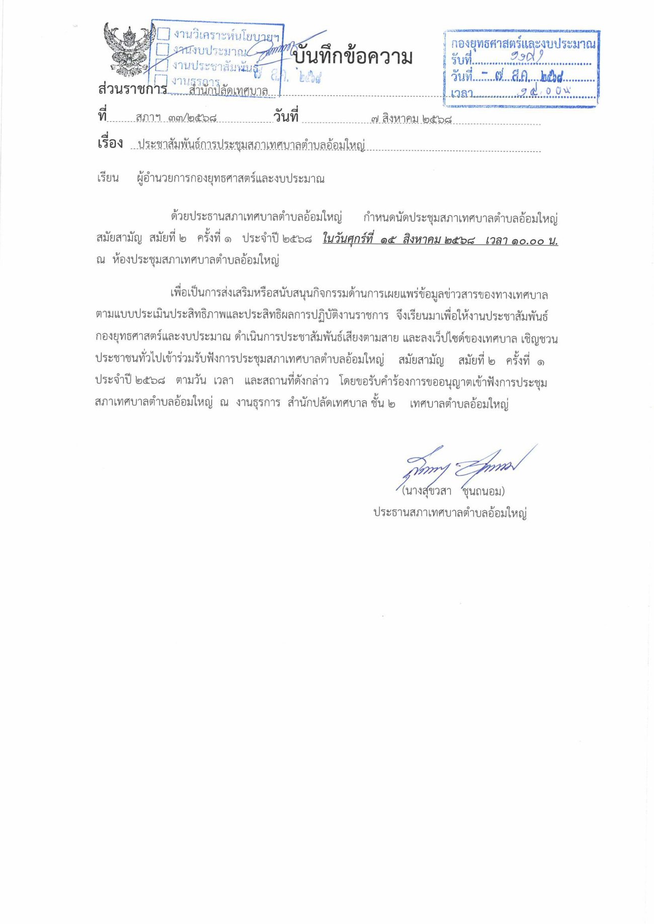 ภาพที่เกี่ยวข้อง กำหนดนัดประชุมสภาเทศบาลตำบลอ้อมใหญ่ สมัยสามัญ สมัยที่ 1 ประจำปี 2568 ในวันศุกร์ที่ 15 สิงหาคม 2568 เวลา 10.00 น. ณ ห้องประชุมสภาเทศบาลตำบลอ้อมใหญ่