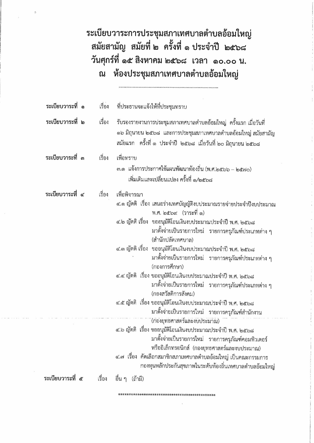 กำหนดนัดประชุมสภาเทศบาลตำบลอ้อมใหญ่ สมัยสามัญ สมัยที่ 1 ประจำปี 2568 ในวันศุกร์ที่ 15 สิงหาคม 2568 เวลา 10.00 น. ณ ห้องประชุมสภาเทศบาลตำบลอ้อมใหญ่