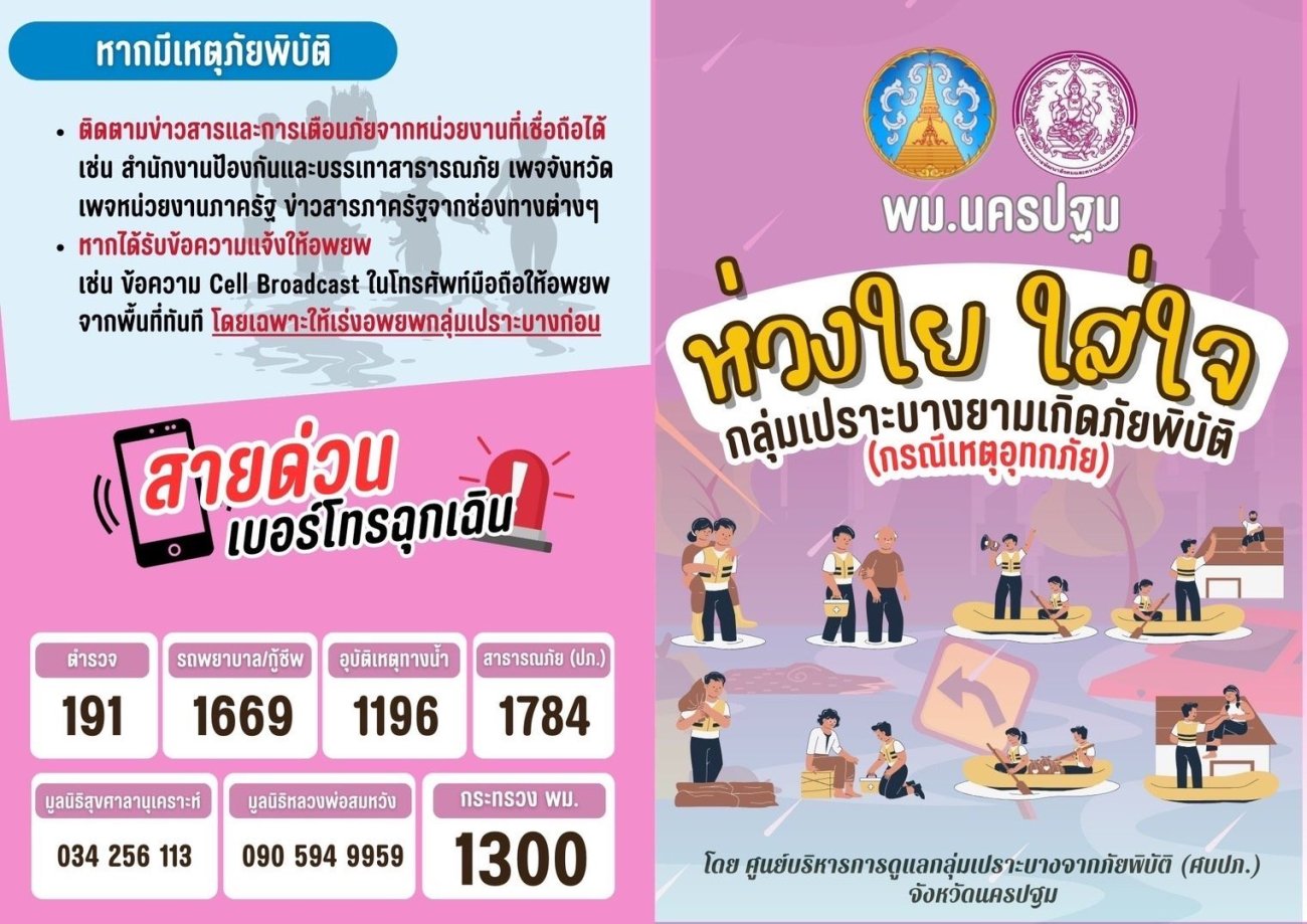แผ่นพับประชาสัมพันธ์แนวทางการดูแลกลุ่มเปราะบางยามเกิดภัยพิบัติ (กรณีเหตูอุทกภัย)