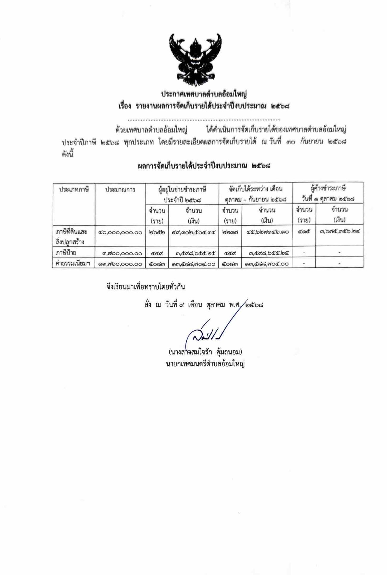 ภาพที่เกี่ยวข้อง ประกาศเทศบาลตำบลอ้อมใหญ่ เรื่อง รายงานผลการจัดเก็บรายได้ประจำปีงบประมาณ 2568