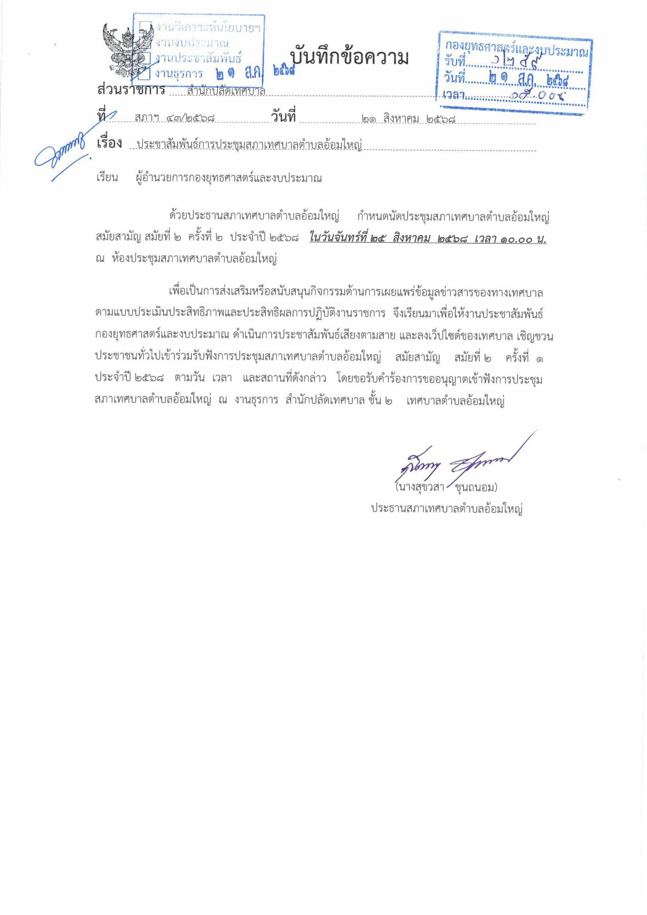 กำหนดนัดประชุมสภาเทศบาลตำบลอ้อมใหญ่ สมัยสามัญ สมัยที่ 2 ครั้งที่ 2 ประจำปี 2568 ในวันจันทร์ที่ 25 สิงหาคม 2568 เวลา 10.00 น. ณ ห้องประชุมสภาเทศบาลตำบลอ้อมใหญ่